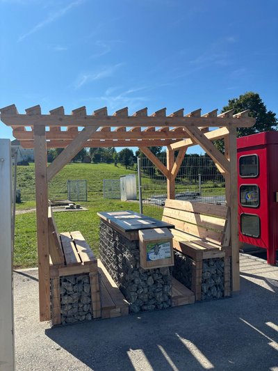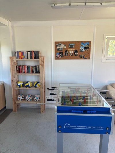 Wir haben eine überdachte Sitzgelegenheit mit Tisch gebaut, in die drei Spiele mit zugehörigen Spielanleitungen und Figuren integriert sind. Es wurden noch zwei weitere Sitzgelegenheiten neben dem Beachvolleyballfeld erbaut. Aus einer alten Telefonzelle wurde eine Bücherzelle für Jung und Alt. Die Zusatzaufgaben wurden ebenfalls alle erledigt, dazu zählten der Aufbau der zwei Fußballtore, der Aufbau des Fußballtisches und der Montage der Dartscheibe. Wir wollten den Gemeinschaftscontainer aber noch weiter verschönern und bauten deshalb einen Couchtisch, ein Bücherregal und hängten eine Fotowand auf.