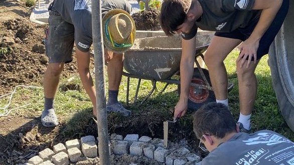 Währenddessen sind die Burschen voll am Werken 🔨💪. Die Pflasterarbeiten nähern sich dem Ende, und unsere zweite Burschen-Gruppe kümmert sich bereits brav um die Sitzgelegenheiten, die bald aufgestellt werden sollen 🪑✨.