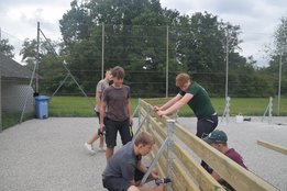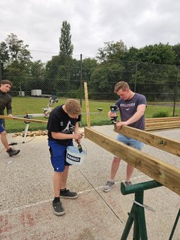 - Die Hölzer werden zugeschnitten, verschraubt und gemeinsam mit Pfosten und Fußballtoren fixiert – damit niemand ins „Abseits“ gerät.