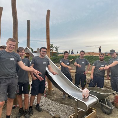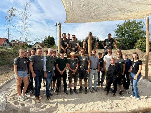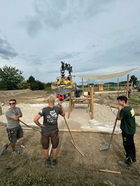 Als ich bei den Burschen vorbeigeschaut habe, hab ich gar nicht alle gefunden, weil sie sich in verschiedene Gruppen aufgeteilt haben – sehr gscheid wennst mich fragst. Einige haben die Hütten gebaut, was sich als sehr herausfordernd herausgestellt hat, weil sich einige Fehler eingeschlichen haben. Das Klettergerüst wurde montiert und einige Feinheiten wurden mit dem Bagger noch ausgebessert. Andere haben Löcher ausgegraben für die Pfosten die dann hinein betoniert wurden. Weitere Arbeiten, die keiner außer ich gesehen hat, waren das Wiese ausmähen und das Beton mischen außerdem wurde das Holz noch passend zugeschnitten und geschliffen damit die Sicherheit der Kinder gewährleistet ist. Somit steht jetzt das Grundgerüst für das Sonnensegel und wir schafften es alle drei Holzhütten fertig zu bauen.