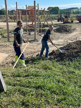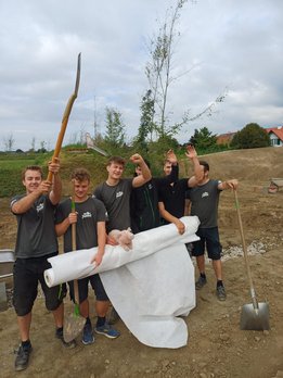 Am Projektort wurde ebenfalls fleißig gearbeitet: Die Burschen haben mit Spaten das Gelände bearbeitet und den Vlies für die Sandkisten gelegt.