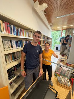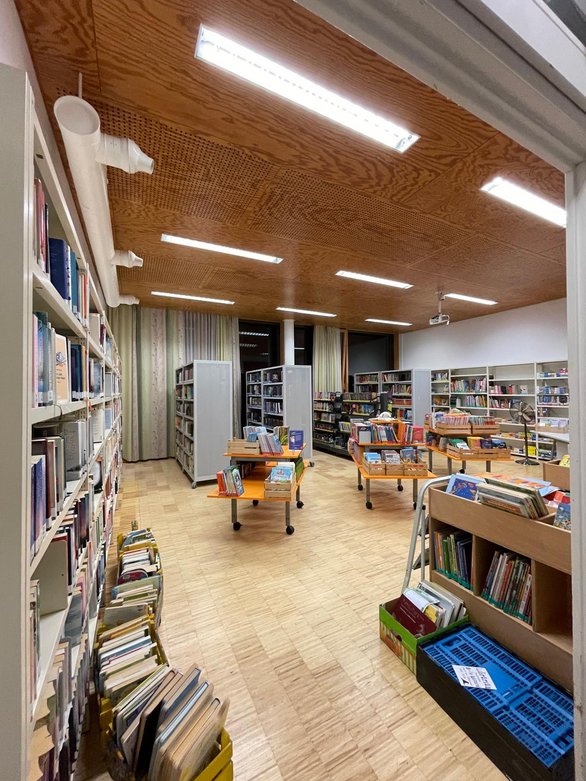 Die neue Bibliothek ist bereits gut gefüllt und es werden weiter fleißig Bücher geschleppt, sortiert und eingeräumt.