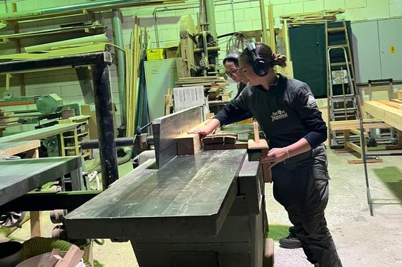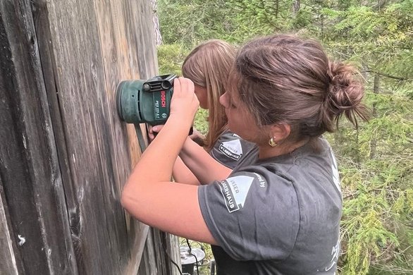 Bereits früh am Morgen trafen wir uns, um an unserem Projekt weiterzuarbeiten. Gleich zu Beginn wurden Bretter zugeschnitten und gehobelt, damit wir das benötigte Material für die weiteren Arbeiten vorbereiten konnten. Einige von uns machten sich daran, die Hütte abzuschleifen. Auch die Schilder wurden zugeschnitten und anschließend mit einem Brennstab beschriftet.