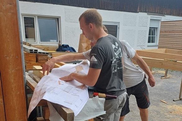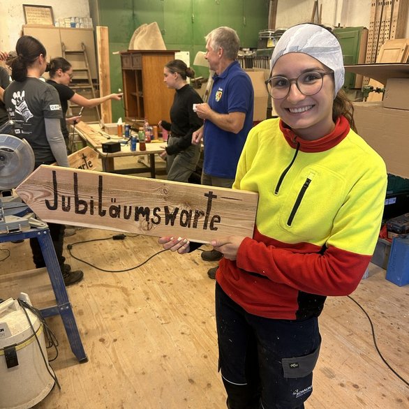 Gestärkt und motiviert machten wir uns anschließend wieder ans Werk. Es wurden die Bretter für unsere Plattform zusammengeschraubt, ein kleiner Tisch gezimmert und Schilder gelasert. Parallel dazu wurde bereits für unser zukünftiges Aussichtsplatzerl betoniert.