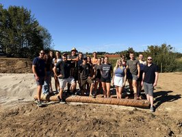 Nach einer kleinen Stärkung ging es auch schon wieder auf die Maschinen. Mit einigen Traktoren wurde der Kies gebracht, damit der der Einstieg in unseren Beach betoniert werden kann. Auch wenn die Hände der Burschen mittlerweile schon etwas müde werden, kennen sie kein Ende. Mit viel Feingefühl schütten sie den Beton in die richtige Position. Während unser "Bacherl Beach” Schritt für Schritt Form annimmt, wird sich auch schon um die rundum Gestaltung gekümmert. Wo gerade noch lose Bretter waren, sind jetzt schon Tipis entstanden.