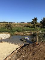 heute ging es schon früh mit neu gestärkten Kräften los bei der Landjugend. Ich bin aber erst etwas später dazu gestoßen. Sie haben schon den Bachzugang fertiggestellt und das Wasser versucht, in der richtigen Menge aufzustauen. Die Holzpfosten, die rund um das Kies und den Beton liegen, lassen den Einstieg ins kühle Nass ganz einfach bewältigen.