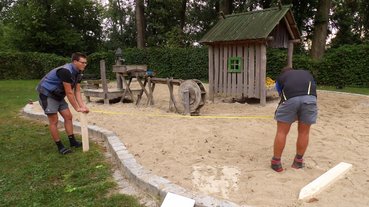 Das Holzteam setzte die Überdachung der Sandkiste auf und die Sitzbank um den Baum wurde fertiggestellt. Die neu gesetzten Bäume bekamen Holzsteher, damit sie gut wachsen können. Bei dem Dach der Jausenstation wurde fleißig weitergearbeitet.