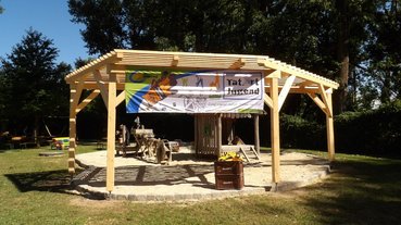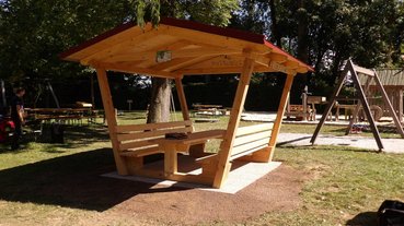 Das überdachte Jausenplatzerl ist liebevoll mit einem Schild, auf dem sich alle Mitglieder verewigt haben, dekoriert. In einem selbstgebauten Buch können die Spielplatzbenutzer über die Landjugend Wieselburg, die Volkstanzgruppe Wieselburg und über die Entstehung des Projekts lesen.