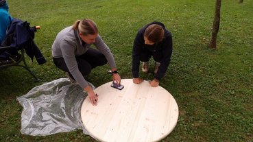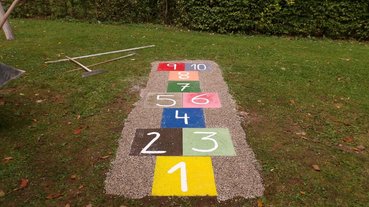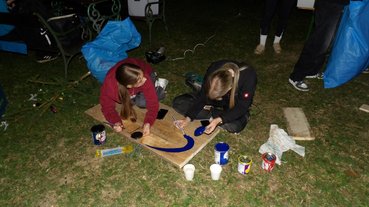Vormittags arbeiteten wir weiter an der Fertigstellung des Hüpfspiels. Für mehr Spiel und Spaß wurde auch gesorgt und unser Kreativteam gestaltete ein Mensch Ärgere Dich nicht Spiel. Außerdem stellte unser Betonteam das Fundament für die Überdachung der Sandkiste fertig. Die Überdachung wurde währenddessen von unserem Holzteam abgebunden und gestrichen.