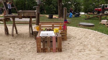 Die Sandkistenüberdachung spendet bis in den späten Nachmittag Schatten, damit die Kinder beim Spielen keinen Sonnenbrand bekommen. Außerdem können sich die Kinder bei den beiden liebevoll dekorierten und gut ausgestatteten Matschküchen mit dem Wasser abkühlen.