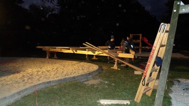 In der zweiten Nachtschicht wurde das überdachte Jausenplatzerl gedeckt und an der Sitzbank um den Baum wurde auch fleißig gearbeitet. Die Überdachung über der Sandkiste nahm auch schon Gestalt an und gehört nur noch fertig aufgesetzt.