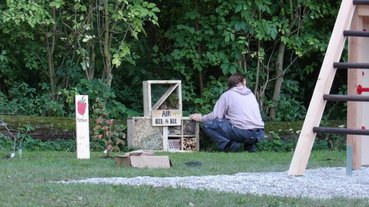 Anschließend können sie in der Naschecke wieder zu Kräften kommen und dabei in dem nebenstehendem Insektenhotel die kleinen Tierchen beobachten. Außerdem können sich die Kinder an der Infotafel über die Wichtigkeit der Insekten informieren.