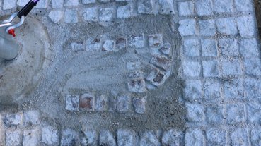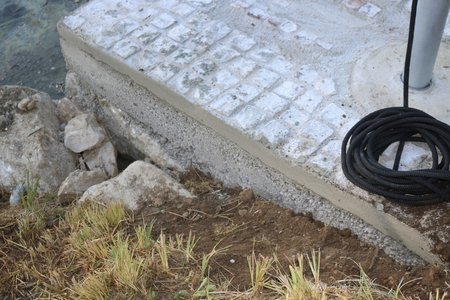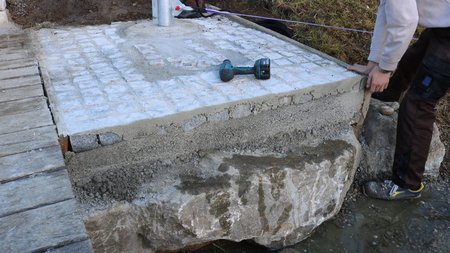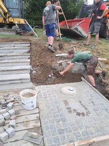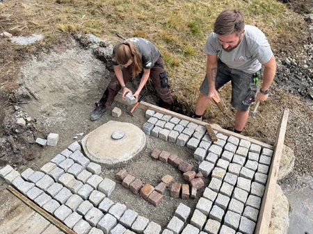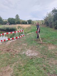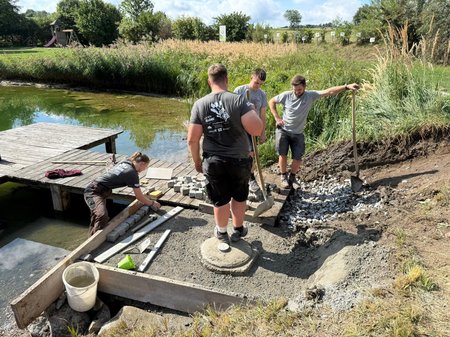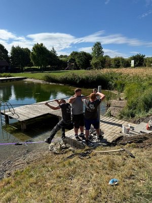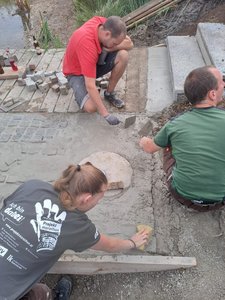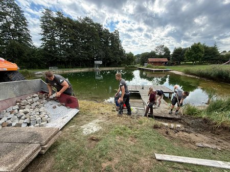Für den Zugang zur Slackline wurde unser Hinkelstein mit Schotter zugeschüttet und nochmals darüber betoniert. Nun setzen wir Pflastersteine, damit die Teichbesucher:innen künftig einfach die Slackline erreichen können. Wir haben uns bewusst gegen eine hölzerne Erweiterung des Steges entschieden, da Steine weitaus langlebiger sind und keine Gefahr besteht, sich Holzsplitter zuzulegen.