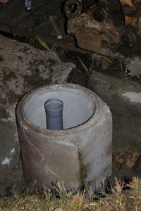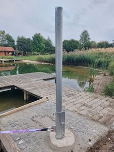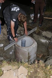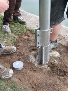 Beim ersten Fundament, das schon fast vollständig getrocknet ist, wird nun in das Kunststoffrohr ein Stahlrohr gesteckt, worauf die spätere Slackline-Konstruktion angebracht wird. Ergänzt wird das Rohr durch zwei Stahlmanschetten, an denen später die Slackline und das Halteseil befestigt werden.