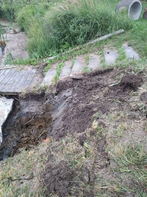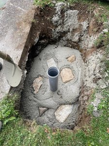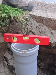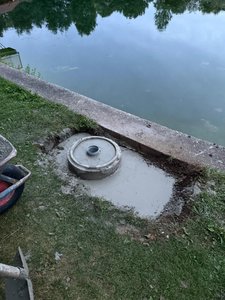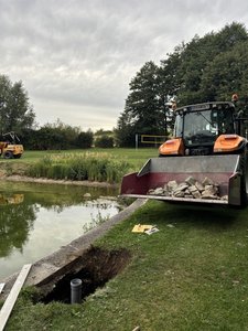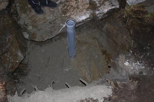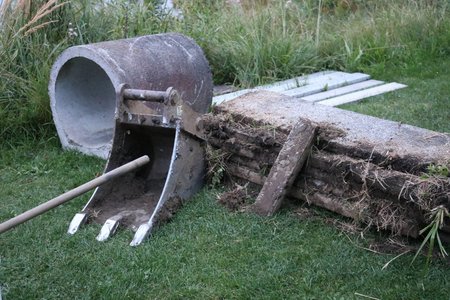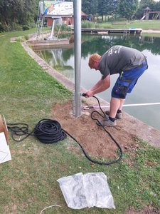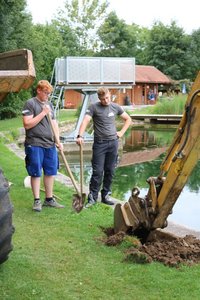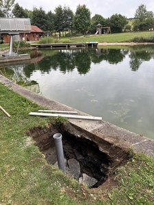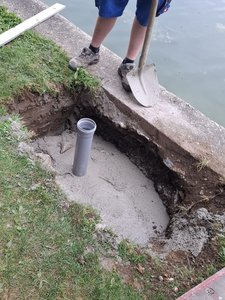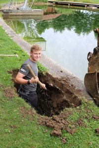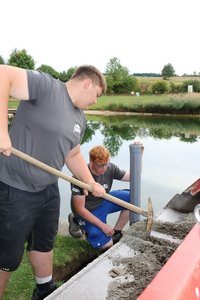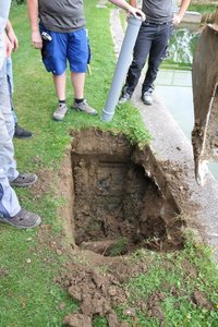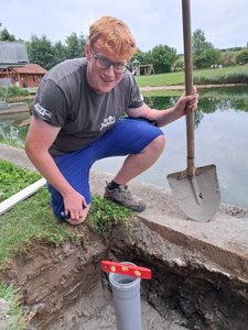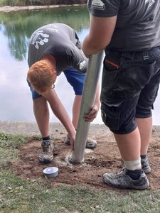 Auch am anderen Ende des Teichs füllt sich unsere ausgehobene Grube. Der angebrachte Hinkelstein dient als Abgrenzung zum Wasser und hat somit eine tragende Rolle. Auch hier wird ein Kunststoffrohr eingebaut, um später die Halterung für die Slackline anbringen zu können.