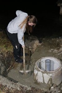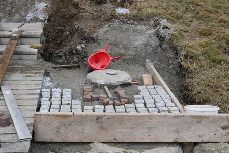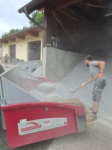 Nach erfolgreichem Abschluss der Grabungsarbeiten – es wurden (leider) keine historisch relevanten Funde oder Goldschätze ausgebuddelt – startet der Mischvorgang des Betons, der unser Fundament bilden wird. Der Zement dafür wurde bereits von der Gemeinde zum Teich gebracht.