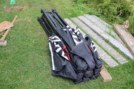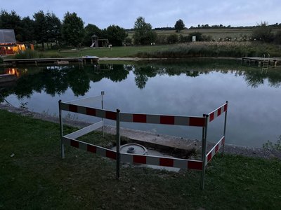 Nicht genug, dass wir an unserem Teich von Wasser umgeben sind, hat es auch noch zu regnen begonnen. Davon lassen wir uns aber nicht aufhalten und haben kurzerhand Pavillons organisiert. Sobald die Pavillons am Teich angekommen sind, hat es schlagartig aufgehört zu regnen. August, August, der macht, was er will … oder so?