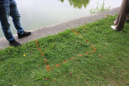 Nach der Projektübergabe startete das gesamte Team los Richtung Teich, um den Tat.Ort zu besichtigen. Hier soll in den nächsten 42,195 Stunden eine Slackline über dem Wasser entstehen. Die Plätze, an denen die Fundamente entstehen sollen, sind bereits markiert. Vor Ort wurden die wichtigsten Rahmenbedingungen geklärt. Andreas Lackner erläuterte die Vorgangsweise und gab uns hilfreiche Tipps für die Umsetzung. Außerdem steht uns Johannes Geyer als Berater zur Verfügung.