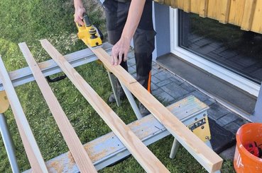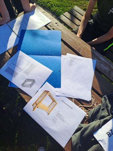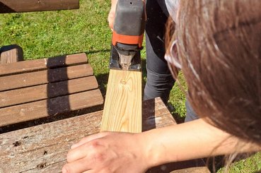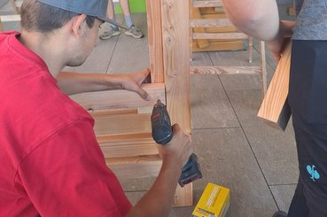 Nach unserer Mittagspause ging es weiter mit unserer Hollywoodschaukel. Mit langen Schrauben wurden die vorbereiteten Pfosten zu dem Außenrahmen zusammengefügt. Weiters wurden die Ecken mit Querstücken verstärkt, um einen guten Halt zu gewährleisten. Mit vielen kleinen schmalen Holzpfosten wurde der Zwischenraum der Außenrahmen gefüllt, somit erhält die Schaukel ein Rastermuster.