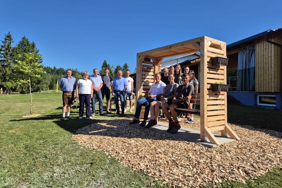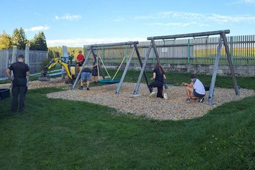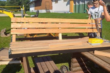 Natürlich braucht es zum Schaukeln, auch eine bequeme Schaukel mit Lehne. Der vom Vormittag fertige Eisenrahmen kam nun endlich zum Einsatz. Mit Holzlatten wurde der Sitzteil bis zur Hälfte an den Rahmen angeschraubt. In einem gewissen Schräggrad wurden die Holzpfosten an die andere Hälfte nach hinten geschraubt, damit man mit den restlichen Holzlatten eine Lehne zimmern konnte. Jetzt musste nurmehr die Schaukel mit dem Eisengestell verbunden werden. Mit langen dicken Ketten konnte das problemlos befestigt werden. Somit kann man zu dritt gefahrlos auf der Hollywoodschaukel die Seele baumeln lassen. Natürlich brauchte das Ganze noch einen Blickfang. Mit den gesponserten Blumen vom Lagerhaus Litschau wurden die Blumenkisten an den Sprossen des Außengestells befestigt. Zum Schluss wurde rundherum noch Hackschnitzel am Boden verteilt. Nun kann man die Hollywoodschaukel von allen Seiten bewundern.