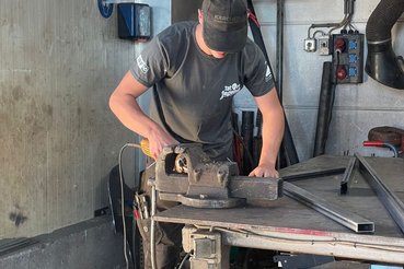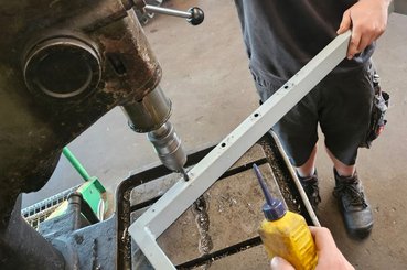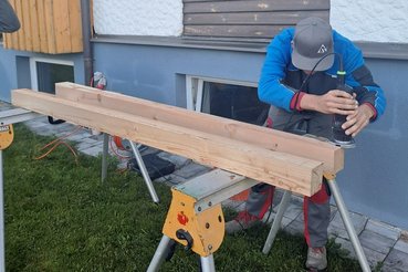Jetzt geht es an den Eisenrahmen der Schaukel. Die fertig getrockneten Elemente wurden im Lagerhaus Litschau fertig zusammengeschweißt und Löcher für die Schrauben wurden vorgebohrt. Gleichzeitig wurden die Holzpfosten gebohrt und die kleinen Hölzer für den Außenrahmen fertiggefräst.