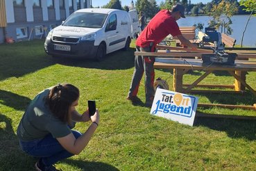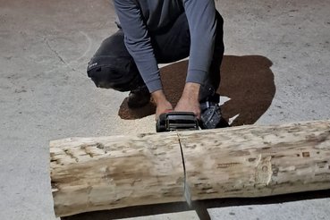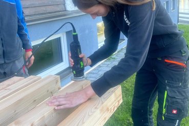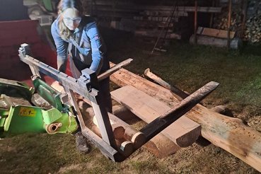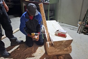Die Nachtschicht hat angefangen und das Zusatzprojekt nimmt Form an. Von unserem letzten Forstwettbewerb sind noch sehr schöne Holzrundlinge übriggeblieben. Daraus sollen Sitzgelegenheiten in der Gemeinde Reingers entstehen. Dabei wurden auch Schilder unserer Sponsoren angebracht, die uns das Sägen, Schrauben und Hobeln der Rundlinge gespendet haben. Aber die Bänke sind noch nicht fertig. Mit Rintelmesser und dem Flexgerät wurde die Rinde entfernt und die Oberflächen glattgeschliffen. Mit der Motorsäge wurden Einkerbungen in die „Füße“ der Bänke geschnitten, damit die runde Form Halt fand. Mit langen Schrauben wurde alles festgemacht und aus Holzstecken und dicken Holzlatten wurde eine Lehne gezaubert.