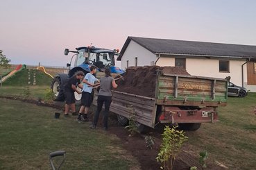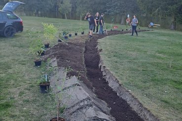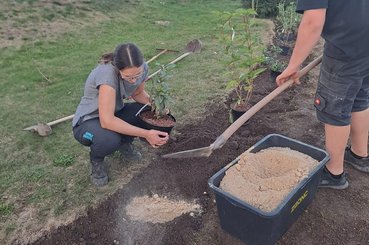 Gemeinsam begutachteten wir die verschiedenen Heckensorten. Um ein schönes Gesamtbild zu erreichen, wurden die einzelnen Pflanzen geschickt angereiht. Nun wurde die ausgehobene Erde gleichmäßig in die 25 Meter lange Grube verteilt und die Pflanzen in angemessenem Abstand platziert. Mit Sägespäne wurden die Heckensorten vergraben, um ein gutes Wachstum zu fördern. Die groben Steine und Wurzeln wurden mit Rechen entfernt und als besonderes Augenmerk wurde feine Erde rund um die Pflanzen angebracht und festgedrückt.