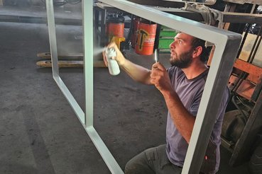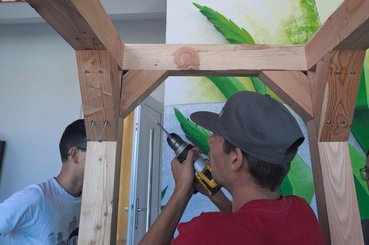 Das bereits zur Verfügung gestellte Holz und Eisen wurde mit dem beigelegten Plan inspiziert. Als erstes wurden die Eisenrahmen für die untere Sitzplatte zurechtgeschliffen und zusammengeschweißt. Damit die Schaukel auch lange und schön aussieht, wurden die Seiten rundherum lackiert. Nun musste alles noch bis morgen gut trocknen. Währenddessen wurde bereits über einen festeren Untergrund für die Schaukel nachgedacht und schlussendlich wurde entschieden, dass eine Pflasterung zwischen den beiden bereits von der Gemeinde betonierten Fundamente der Hollywoodschaukel entstehen soll.