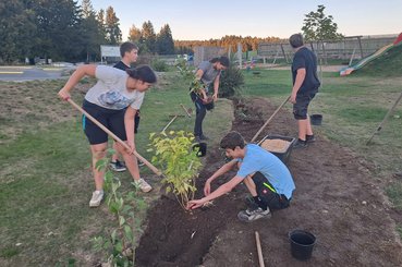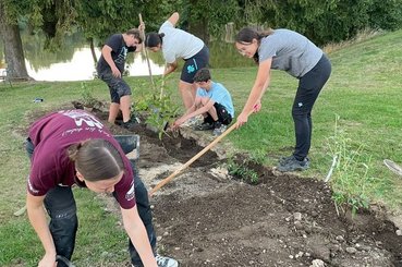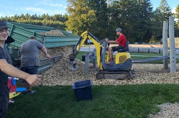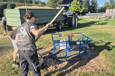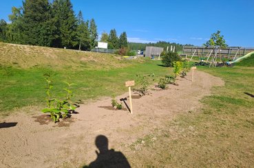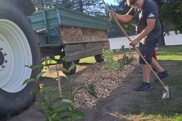 Die am Freitag gesetzte Hecke wurde mit 7 verschiedenen Pflanzensorten gepflanzt. Die gefertigten Holzschilder wurden nun zu den jeweiligen Sorten dazu gesteckt. Damit aber die nackte Erde nicht so sichtbar ist, wurden Hackschnitzel besorgt, um den 25 Meter langen Erdstreifen zu verdecken. Jetzt ist der Sichtschutz nun fertig und auch die Sicherheit der Badegäste ist nun gewährleistet, da die Biker nicht mehr die Liegewiese befahren können und in dem vorgesehenen Pumptrack fahren sollen.