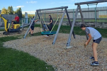 Als allererstes wurde die Matschküche eingerichtet. Mit Metallutensilien wurde ein rustikaler Look geschaffen. Gleich dahinter wurden die recycelten Elemente für das Wasserspiel angebracht, damit die kleinen Kinder auch an heißen Tagen eine kühle Ablenkung gegen Langeweile haben. Weiters wurden die neuen Heckenschilder noch mit Farbe verschönert, damit sie von den Badegästen bewundert werden können. Auch eine der drei selbstgebauten Bänke wurde noch auf den frisch mit Hackschitzel bedeckten Spielplatz an die richtige Stelle gebracht.