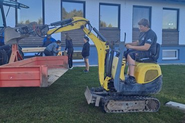 Am frühen Morgen wurde das Grundgerüst der Hollywoodschaukel abgefräst, damit die Kanten runder wirken und es nicht so scharfkantig blieb. Nebenbei wurde zwischen den Fundamentblöcken die Erde und Wiese ausgehoben, um eine gerade Fläche für die Pflasterarbeiten zu schaffen. Ein kleiner Bagger wurde zur Hilfe genommen und mit Heckmulde und Traktor abtransportiert.
