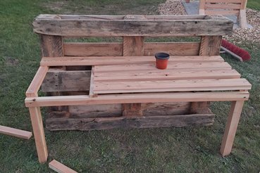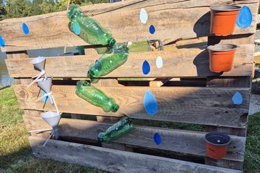 Im Zuge dessen wurde der danebenliegende Spielplatz noch von Unkraut gesäubert und die alten Hackschnitzel durch neue ersetzt. An die kleinen Badegäste wurde auch gedacht. Aus einer alten Holzpalette und den Holzverschnitt der Hollywoodschaukel wurde eine kleine Matschküche und ein Wasserspiel gezaubert. Auf der einen Seite kann man sich mit metallenen Küchenutensilien und einer nachempfundenen Waschschüssel mit Sand und Schlamm aus dem Teich vergnügen. Auf der anderen Seite kann man den Lauf des Wassers verfolgen, durch eine Bahn aus alten Plastikflaschen und verschiedenen Größen von Trichtern. Mit Acrylfarbe wurden die Spiele noch bunt bemalt.