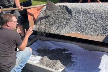 Damit unsere Hollywoodschaukel auch gerade steht, musste der Platz dafür noch richtig gepflastert werden. Die ausgehobene Grube wurde mit Vlies und Schotter gefüllt und mit der Wasserwaage genau abgezogen. Die ausgesuchten Pflastersteine wurden gleichmäßig platziert und mit einem Hammer an Ort und Stelle gebracht. Die am Rand entstandenen Löcher, für die die Steine zu groß waren, wurden fachgerecht mit einer Steinsäge zerteilt und richtig eingesetzt. Mit feinem Sand wurden die Zwischenräume gefüllt und die Steine saubergekehrt. Somit konnten wir das fertige Außengestell der Schaukel hinstellen.