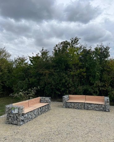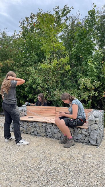Währenddessen war beim Jugendplatz des Generationenparks voller Einsatz gefragt. Die Gitter der Gabionen wurden mit Steinen befüllt, Schicht für Schicht entstand eine stabile Basis. Darauf montierten wir die vorbereiteten Holz-Sitzflächen.