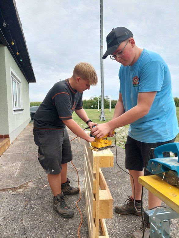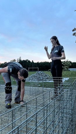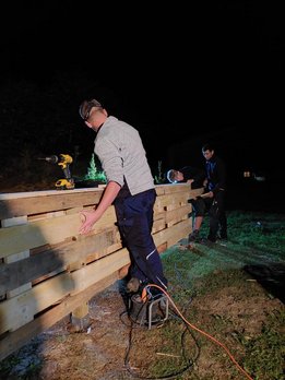 Am Beachvolleyballplatz ging es parallel richtig zur Sache: Die restlichen Pfeiler für die Palettenwand wurden fertig eingeschlagen und exakt ausgerichtet. Mit viel Geduld und Genauigkeit stellten wir sicher, dass alles im Lot ist. Schon bald konnten die ersten Paletten in Position gebracht werden. In der richtigen Höhe gehalten, mit der Wasserwaage kontrolliert und schließlich fest angeschraubt – so wächst Stück für Stück die neue Absperrung.