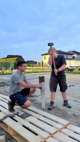 Ein wichtiger Schritt war das Einschlagen der Pfeiler für die Absperrung beim Beachvolleyballplatz. Mit vereinten Kräften und viel Muskelkraft wurden die verzinkten Metallpfeiler gesetzt, an denen wir morgen die vorbereiteten Paletten befestigen können.