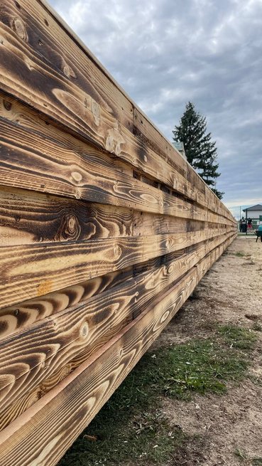 Parallel dazu wurde die gesamte Absperrung geflämmt und bekam ihren letzten Feinschliff. Mit viel Geduld, einem Auge fürs Detail und kräftigen Händen verwandelte sich die Palettenwand in ein stimmiges, rustikales Gesamtbild, das gut in die Umgebung passt.