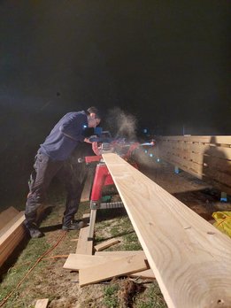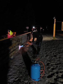 Zeitgleich ging es bei der großen Absperrung am Beachvolleyballplatz weiter. Beide Seiten mussten noch fertig verschalt werden, damit die Konstruktion stabil, sicher und optisch ansprechend wirkt. Anschließend wurde eine Seite bereits geflämmt.