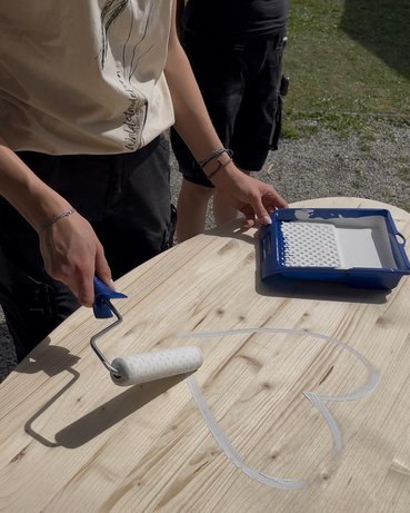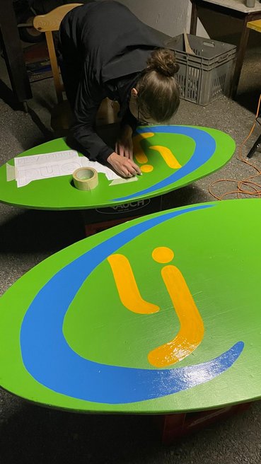 Mit viel Geschick wurden Holzplatten ellipsenförmig mit der Stichsäge ausgesägt. Danach hieß es schleifen, schleifen, schleifen – sowohl die Flächen als auch die Kanten. Anschließend trugen wir die Grundierung auf und legten gleich die erste Farbschicht darüber.