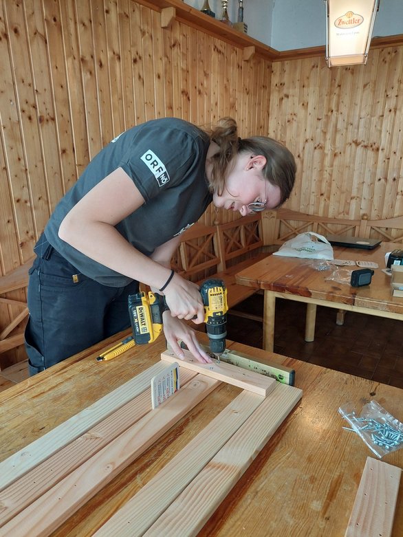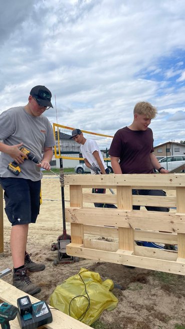 Währenddessen wurden am Beachvolleyballplatz sämtliche Paletten von starken Händen angebracht und verschraubt. Anschließend begannen wir damit, die freien Zwischenräume mit Holzlatten zu füllen – bis uns schließlich ein Regenschauer bremste.