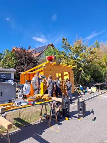 Von den ersten Arbeitsschritten am Freitag, als das Holz vorbereitet und gestrichen wurde, über die Bauarbeiten am Samstag mit Dachkonstruktion, Malerarbeiten und kreativen Vorbereitungen bis hin zu den letzten Feinschliffen am Sonntagmorgen – wir haben gemeinsam alles gegeben, damit das Wartehäuschen pünktlich zur Projektpräsentation fertig wird.