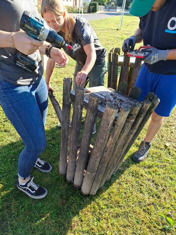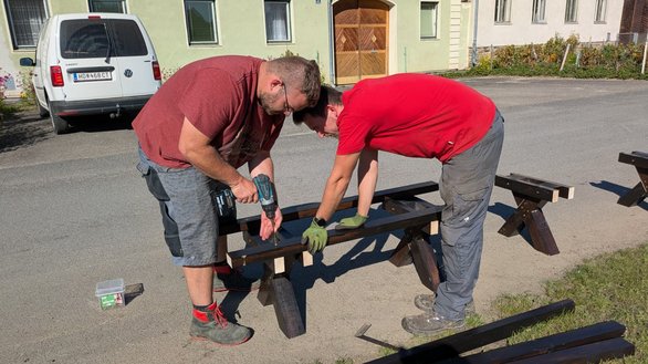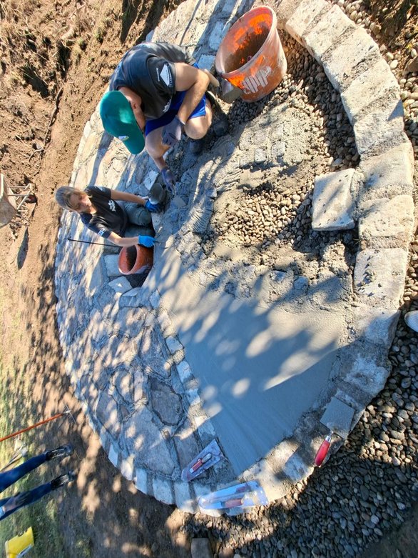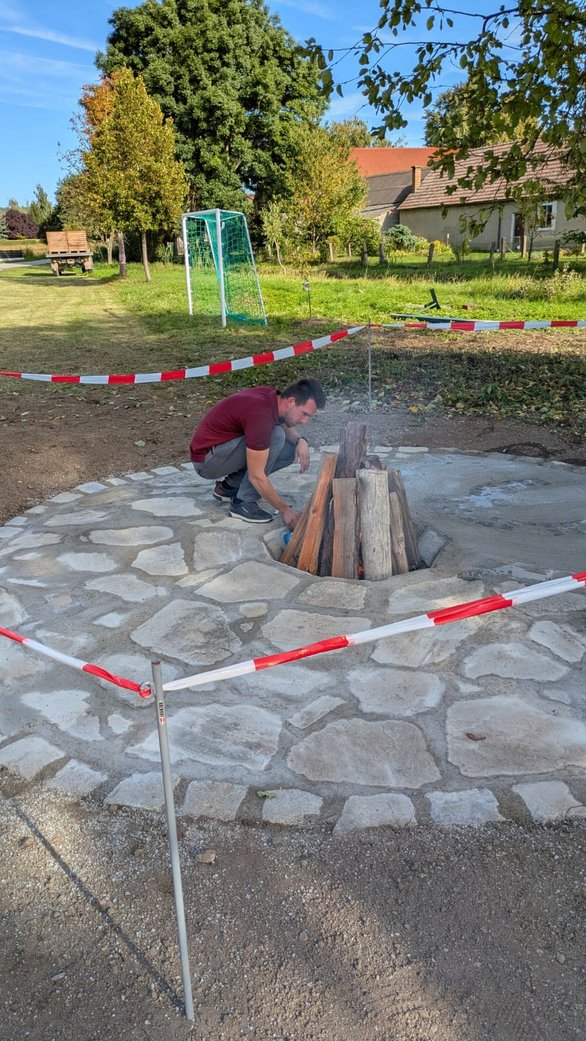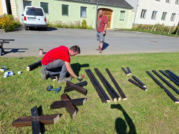 Sonntag morgen um 7:00 begannen wir mit den letzten wichtigen Handgriffen, die Steinplatten wurden verfugt, das Landjugendlogo wurde auf unsere Feuerstelle gepflastert und die letzten Stellen wurden ausbetoniert. Währenddessen begann eines unserer Landjugendmitgliedern den alten, kaputten Basketballkorb zu entsorgen. Danach haben wir die Erde, welche nicht mehr gebraucht wurde entsorgt und haben begonnen unsere Baustelle zusammen zu räumen. Dann wurden noch Grassamen ausgestreut und wir haben das Schild des Projektmarathons an einem Stein bei unserer Feuerstelle montiert. Abschließend haben wir dann noch für unsere Bänke das Holz zurrechtgeschnitten und zusammengebaut.