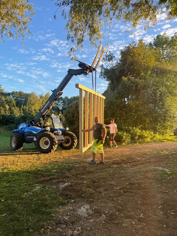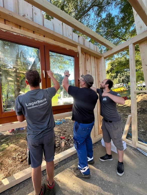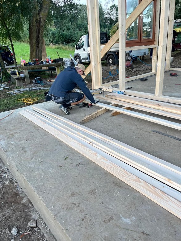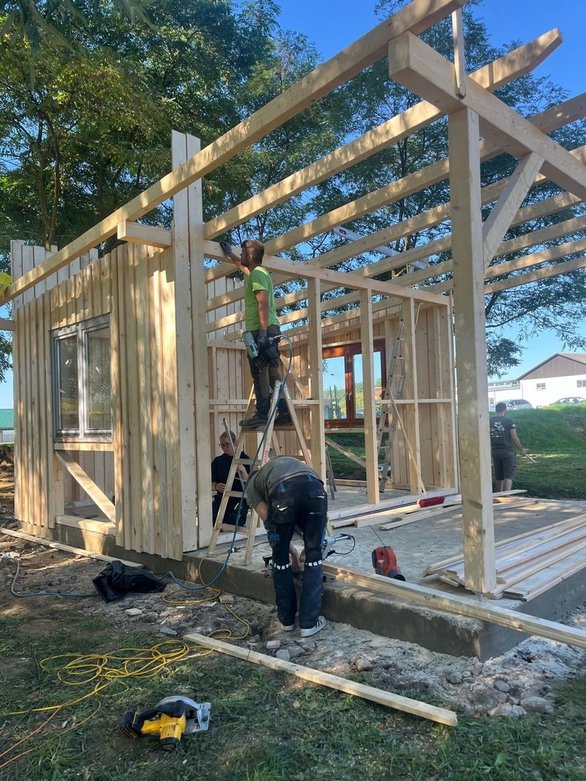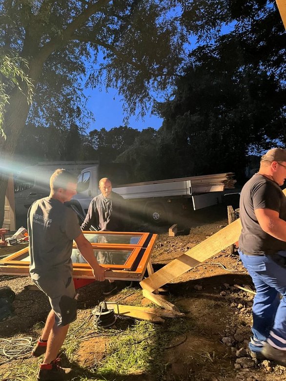 Danach ging es direkt ans Werk: Die Hütte wurde komplett fertiggestellt – alles verblendet, das Dach gedeckt und die Fenster eingebaut. Danach machten wir noch alles schön: Blumen wurden eingepflanzt, draußen wurde das Gras gemäht und die Baustelle sauber aufgeräumt.