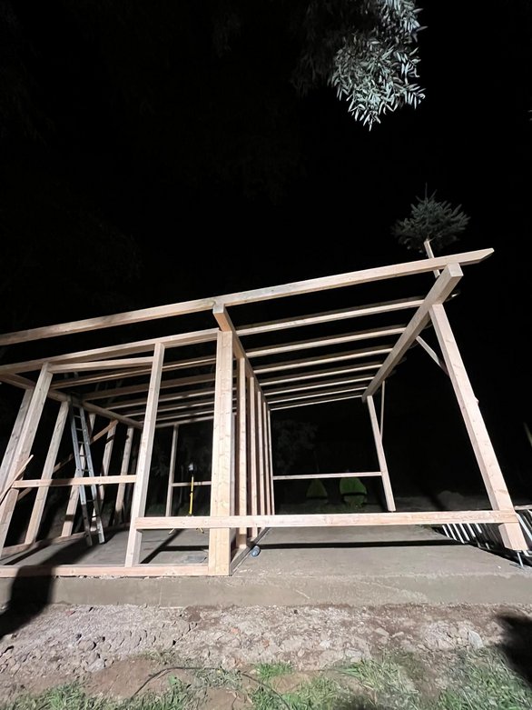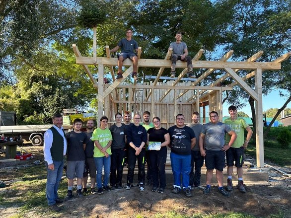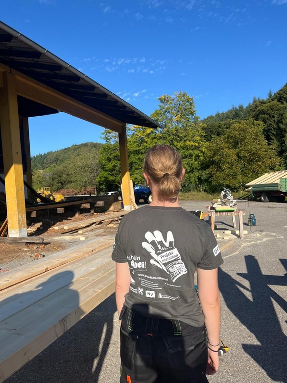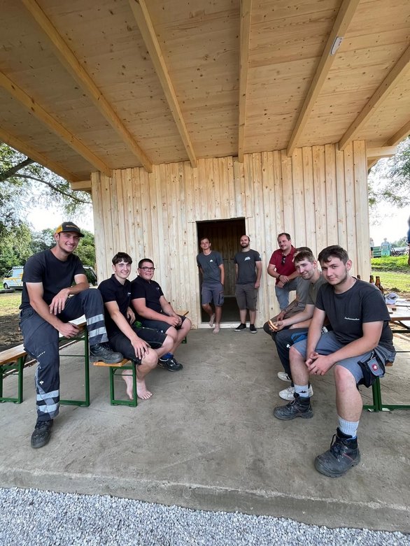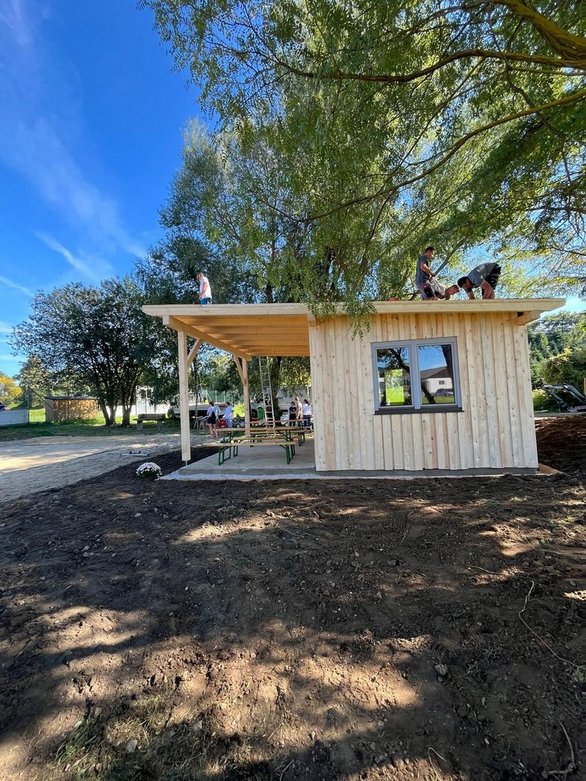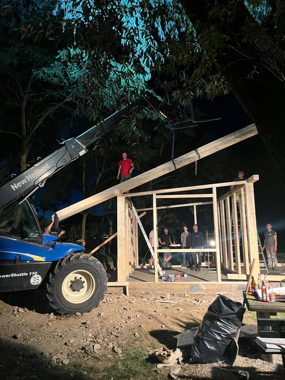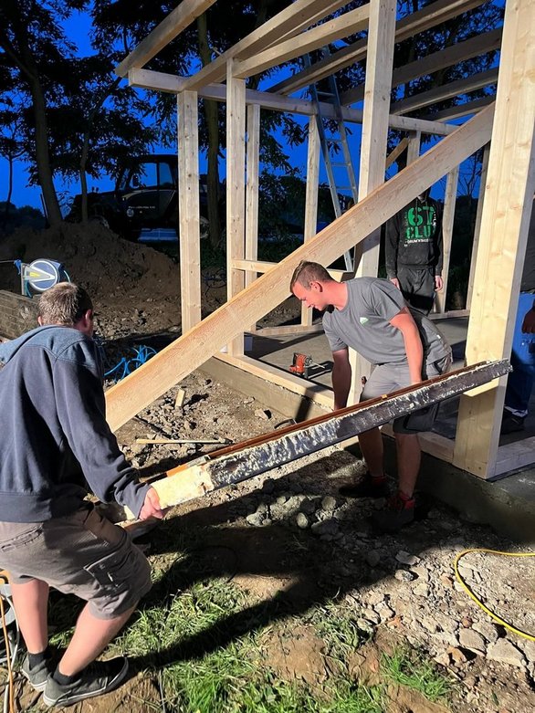 Zum Abendessen verköstigte uns das Gasthaus Ringl mit leckeren „Haus-Pizzn“, die allen die nötige Energie für die letzten Arbeiten gaben. Währenddessen wurde das Grundgerüst der Hütte fertig aufgestellt und anschließend überprüft, ob alles stabil ist. Einige Buam kümmerten sich um letzte Anpassungen, andere räumten das Arbeitsmaterial ordentlich zusammen und bereiteten alles für den letzten Projekttag vor.