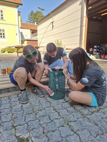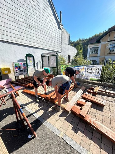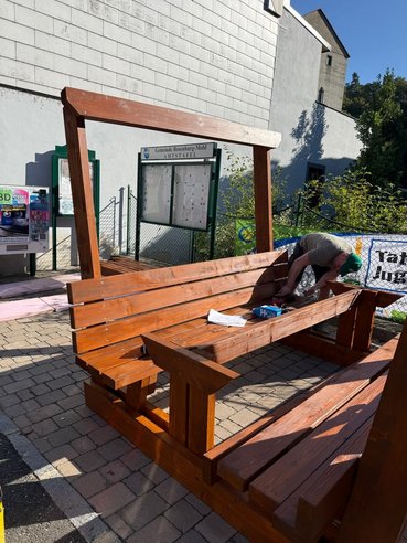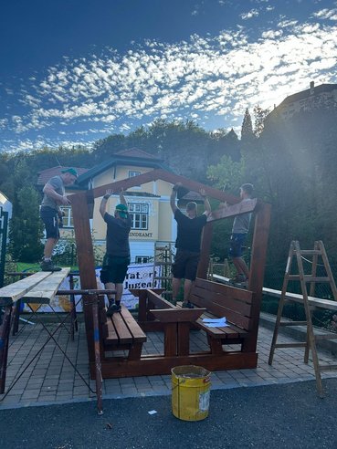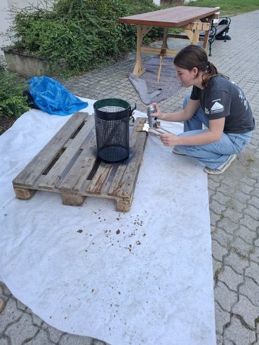 Während ein Teil unserer Gruppe mit dem Zusammenbau der Radlerrast beschäftigt war, widmete sich der andere Teil dem Feinschliff: Der Mistkübel wurde abgeschliffen und mit Farbe besprüht und unsere Schankhütte wurde für die morgige Präsentation vorbereitet. So konnten wir parallel an mehreren Baustellen weiterarbeiten und dem Ziel wieder ein Stück näherkommen.