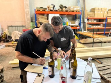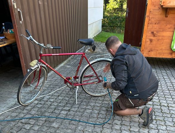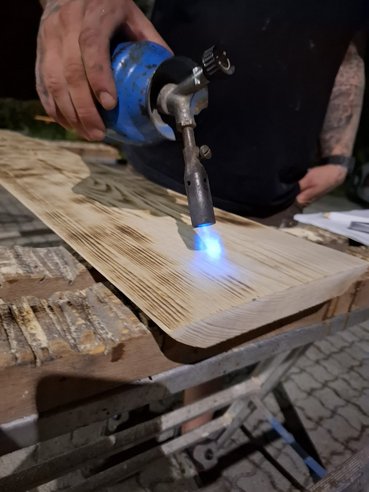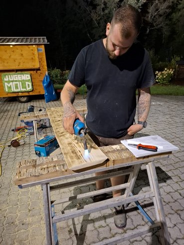 Einige aus unserem Team widmeten sich der Gestaltung unserer Beschilderung. Dafür suchten wir zunächst ein passendes Stück Holz, das anschließend sorgfältig geschliffen wurde. Danach wurde die Schrift eingefräst und das fertige Schild durch Abflämmen veredelt – ein echtes Unikat, das unserer Radlerrast eine persönliche Note verleiht.