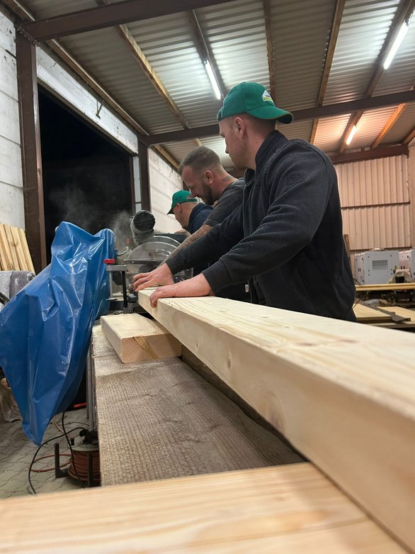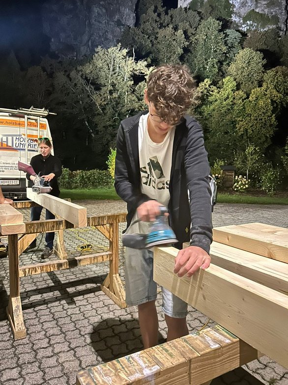 Anschließend ging es an die Holzarbeiten – zusägen, schleifen, streichen und alles so vorbereiten, dass wir am nächsten Tag nahtlos weitermachen können.