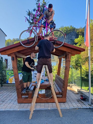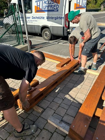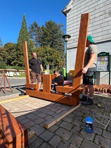 Unsere Radlerrast nimmt zunehmend Gestalt an – mit jedem Handgriff wird deutlicher, wie aus den einzelnen Holzteilen eine gemütliche und funktionale Rastmöglichkeit entsteht. Es ist schön zu sehen, wie die vielen Stunden Arbeit nun sichtbare Früchte tragen und alles Schritt für Schritt zusammenwächst.