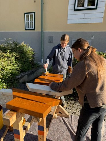 Am nächsten Morgen starteten wir bereits um halb acht mit voller Energie in den neuen Projekttag. Während sich ein Teil der Gruppe darum kümmerte, das restliche Holz zuzuschneiden, waren die anderen schon wieder fleißig am Schleifen und Streichen. So konnten wir parallel an mehreren Arbeitsschritten weiterarbeiten und kamen gut voran.