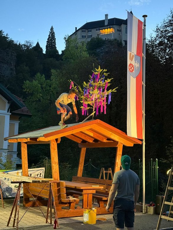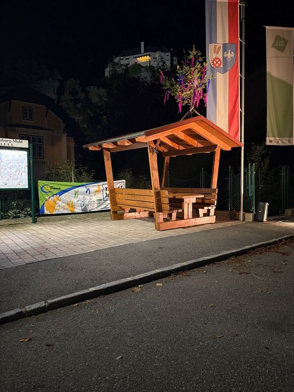 Unsere Radlerrast steht – das Herzstück unseres Projekts ist fertiggestellt! Morgen kümmern wir uns noch um die letzten Feinheiten und bereiten alles für die bevorstehende Präsentation vor. Den Abend lassen wir nun in entspannter Runde gemeinsam ausklingen – zufrieden über das, was wir gemeinsam geschafft haben.